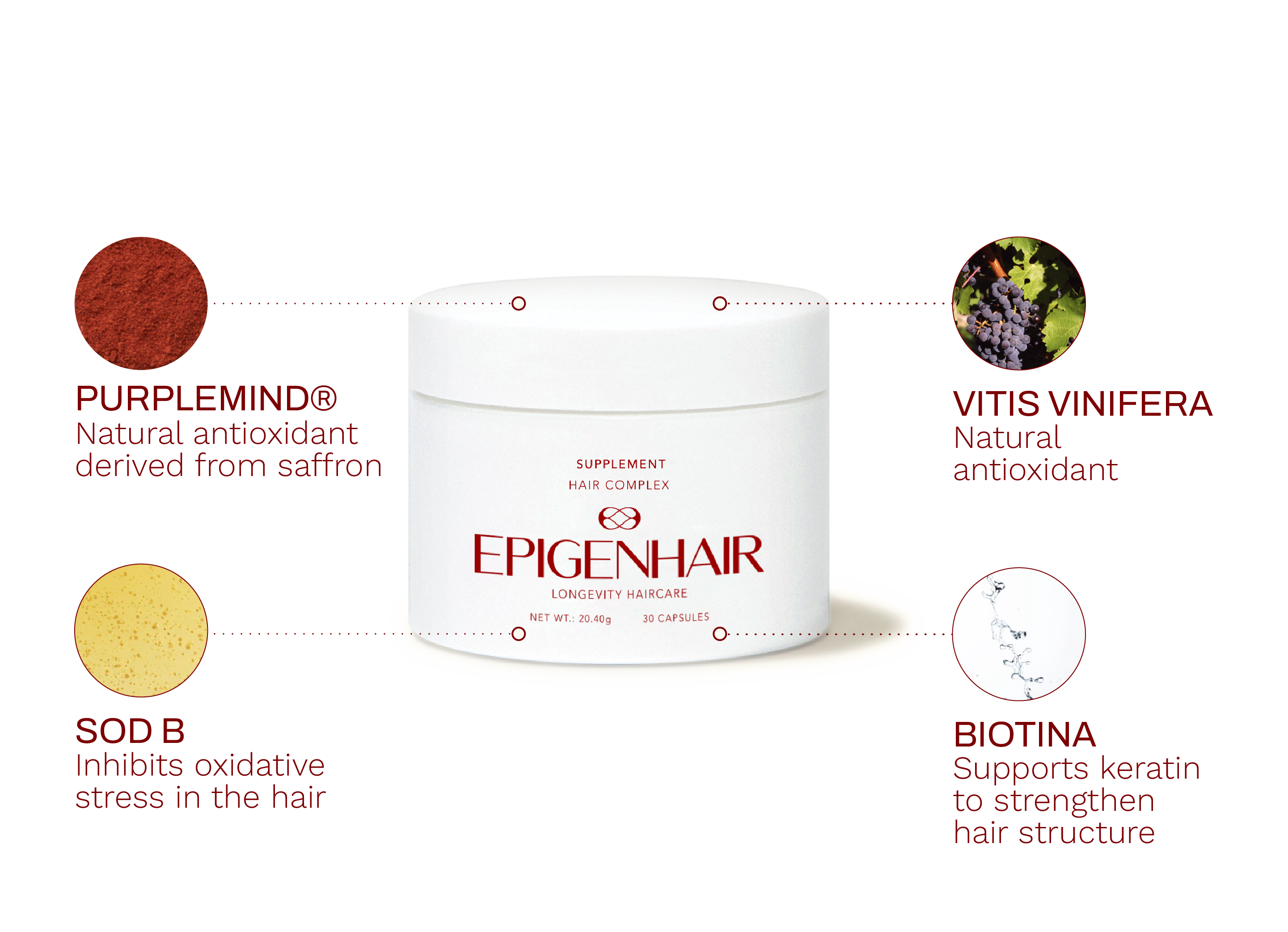 Grape (Vitis vinifera L.) seed ES 95% procyanidins, Polygonum (Fallopia japonica (Houtt.) Ronse Dec) root ES 20% resveratrol*, Bulking agent: Hydroxypropyl methylcellulose, Zinc gluconate, Saffron (Crocus sativus L.) flower-stigma ES 0.3% safranal-0.8% crocins, Manganese gluconate, Superoxide dismutase (SOD) (from Cucumis melo L., maltodextrin, shellac), Vitamin K2 (Corn syrup, maltodextrin, colloidal silica, sodium starch octenyl succinate, mono and diglycerides of fatty acids, ascorbyl palmitate), Vitamin D (cholecalciferol), Selenium L-methionine (0.5% Selenium, dibasic calcium phosphate); Anti-caking agents: Cross-linked sodium carboxymethylcellulose, Colloidal anhydrous silica, Magnesium salts of fatty acids; D-biotin, calcium L-methylfolate. Capsule components: Hydroxypropyl methylcellulose, gellan gum. * on corn maltodextrin