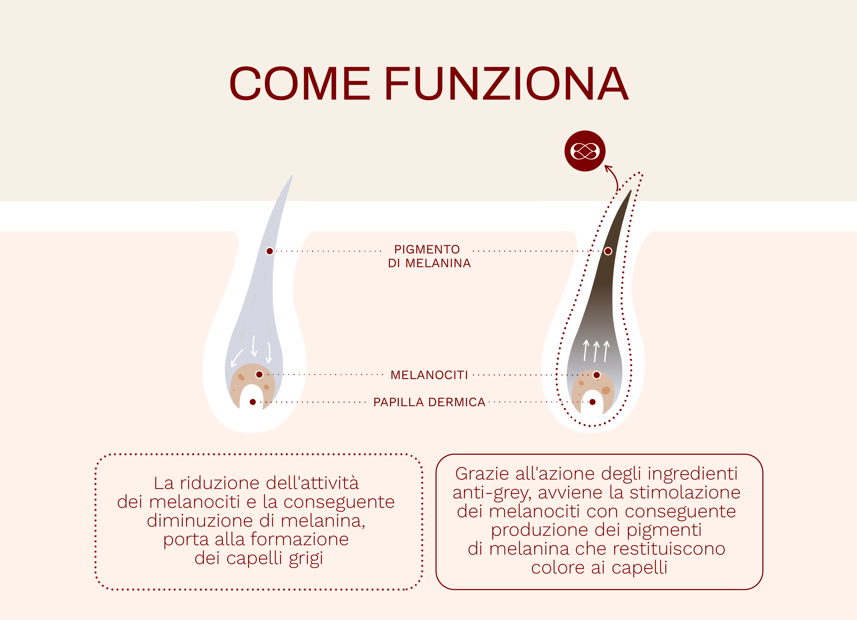 Grazie ad Epigenhair, andiamo direttamente a stimolare l’azione dei melanociti, cellule portatrici di melanina responsabili della ripigmentazione del capello.
